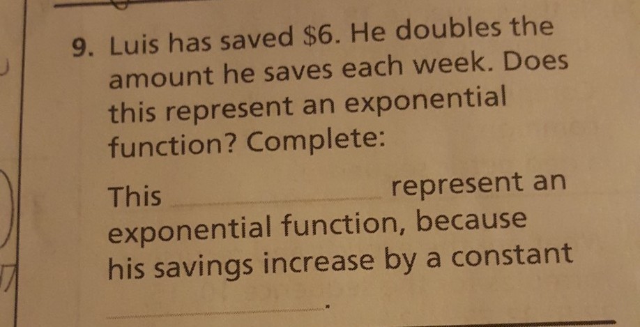 Luis has saved $6. he doubles the amount he saves each week.does this represent an exponential function?complete: