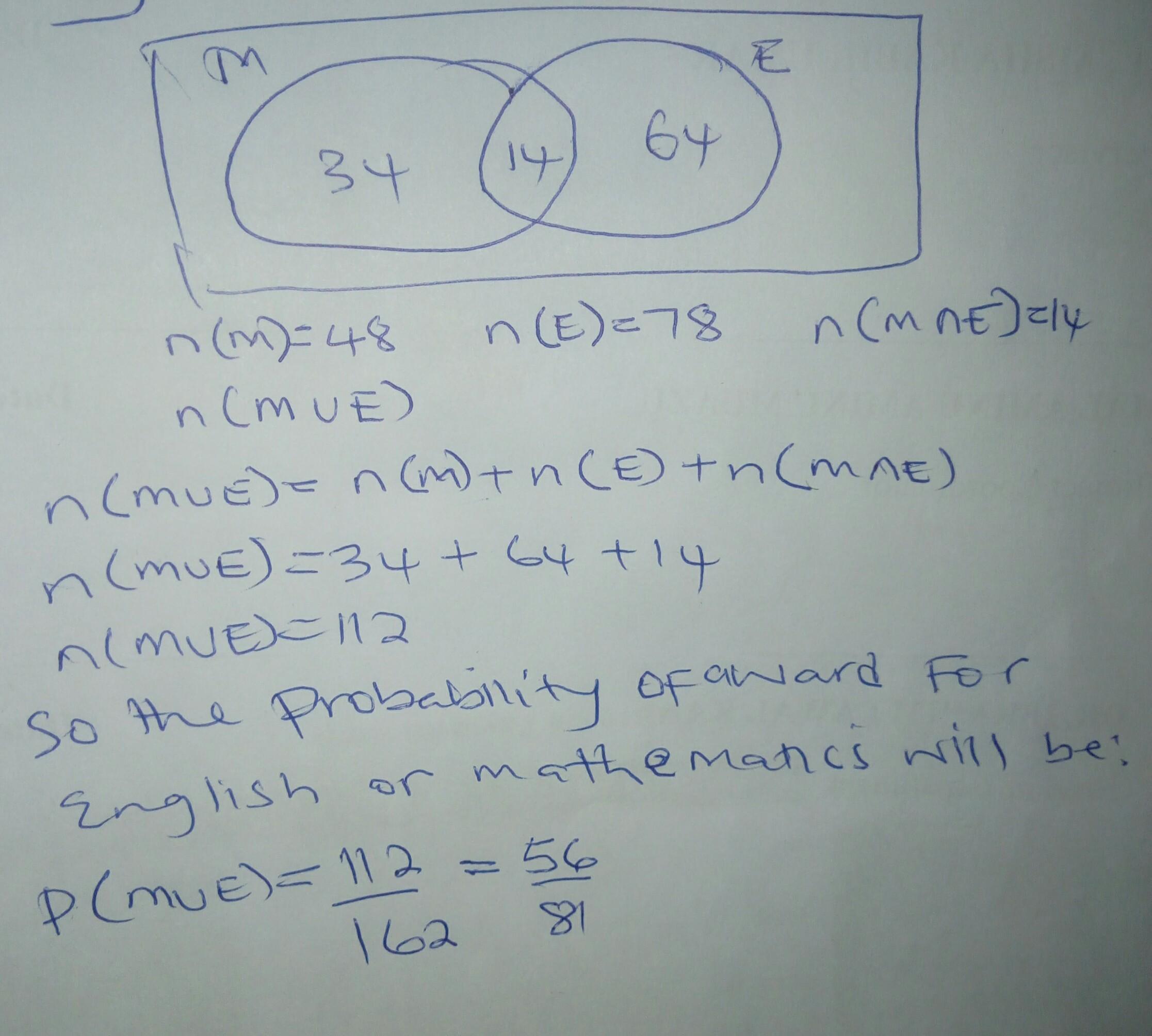 students who won awards for both mathematics and English. A newspaper chooses a student at random for an interview. What is the probability that the student interviewed won an award for English or mathematics?