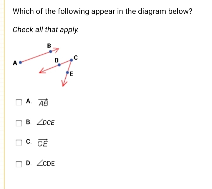 The vector for segment CE is also present in the DCE group, but it does not include point D.