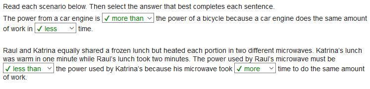 The power output from a car engine is equivalent to that of a bicycle since both perform the same amount of work over time. Both raul and katrina shared a frozen meal, heating each portion in different microwaves. Katrina's portion was warm in one minute, whereas raul's portion required two minutes. Therefore, the power utilized by raul's microwave aligns with that of katrina's, given that it took longer to achieve the same result.