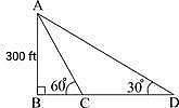 le with measure of angle ABC equal to 90 degrees and length of AB equal to 300 feet. There is a point C on BD such that measure of angle ACB is 60 degrees and measure of angle ADC is 30 degrees. What is the distance, CD, between the boats?