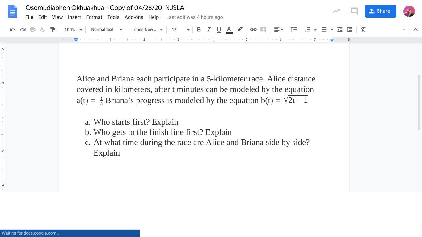 b. They complete the race when their total distance equals 5 kilometers. For Alice: