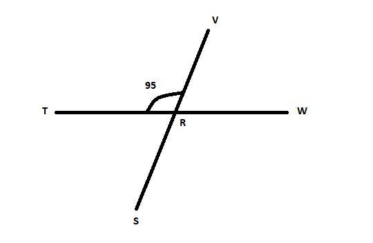 2 intersecting lines are shown. A line with points T, R, W intersects a line with points S, R, V at point R. Angle T R V is 95 d