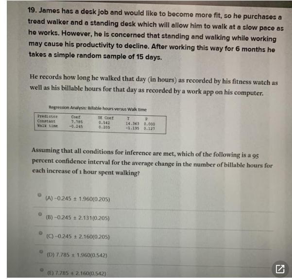 After operating under these conditions for a period of 6 months, he selects a simple random sample of 15 days. He logs the hours he walked each day as tracked by his fitness monitor, alongside his recorded billable hours from a work application on his computer.