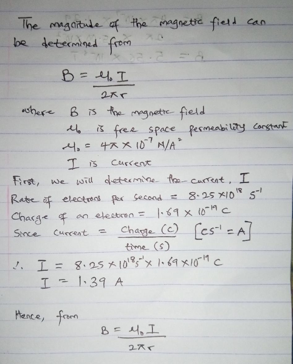 A very long, straight horizontal wire carries a current such that 8.25×1018 electrons per second pass any given point going from