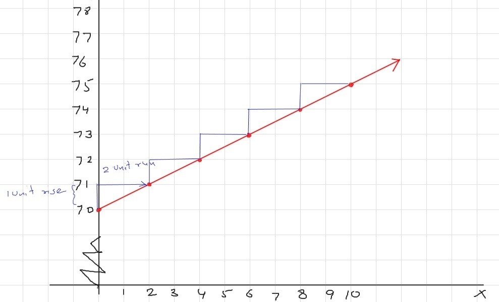 To graph this, we start by plotting the y-intercept at 70 and then add more points based on the rise/run ratio, which is 1/2.