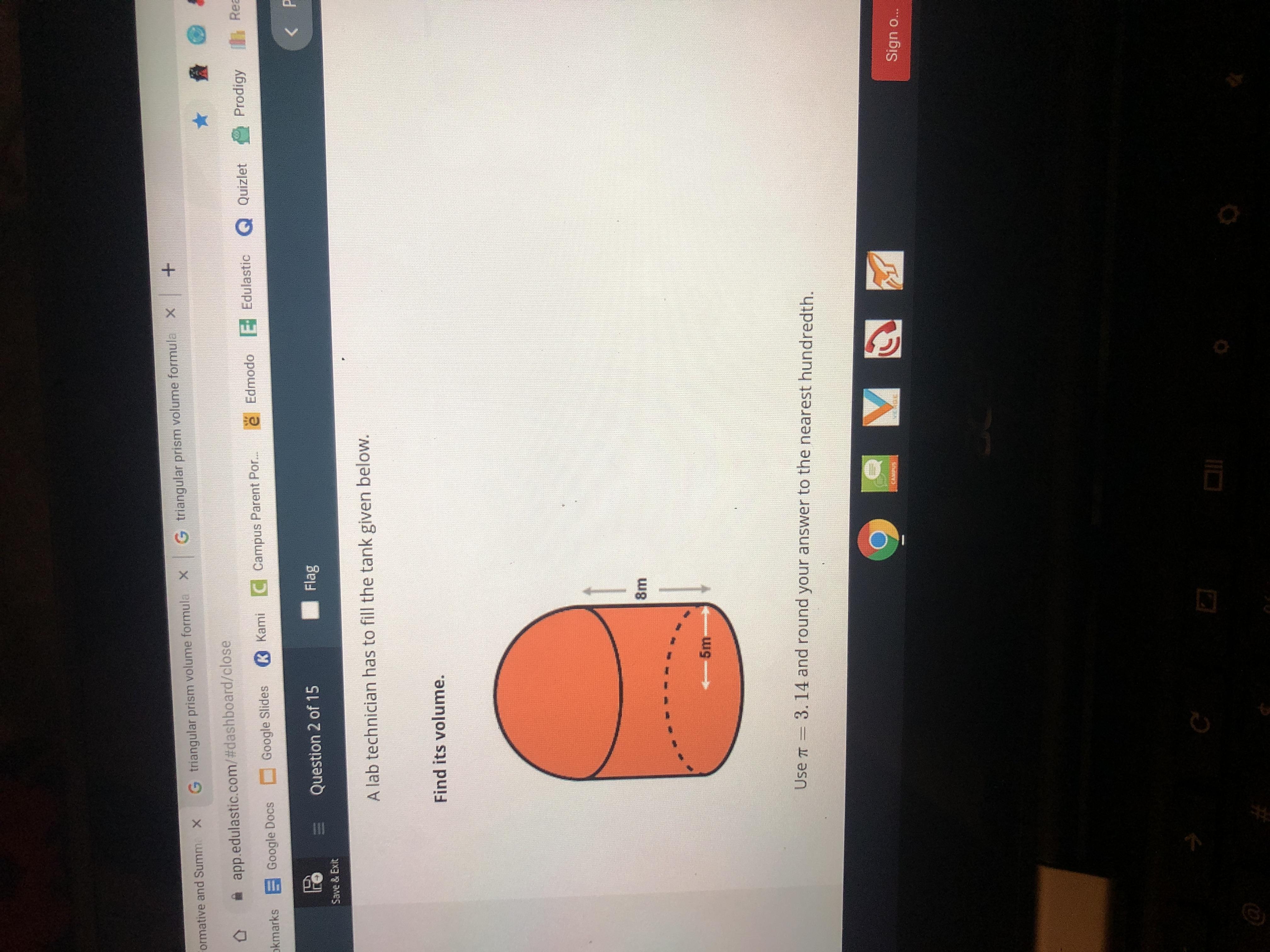 A lab technician has to fill the tank given below. Find it’s volume .