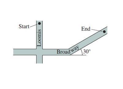 The attached map depicts Olivia's journey to the coffee shop. She rides her bike south for 0.9mi to Broadway after starting at Loomis. Next, she turns east onto Broadway, traveling 0.8mi until the road curves, and then she proceeds another 1.4mi to reach the shop.