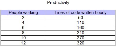 We have a table indicating the estimated lines of code produced by computer programmers per hour when x individuals are engaged.