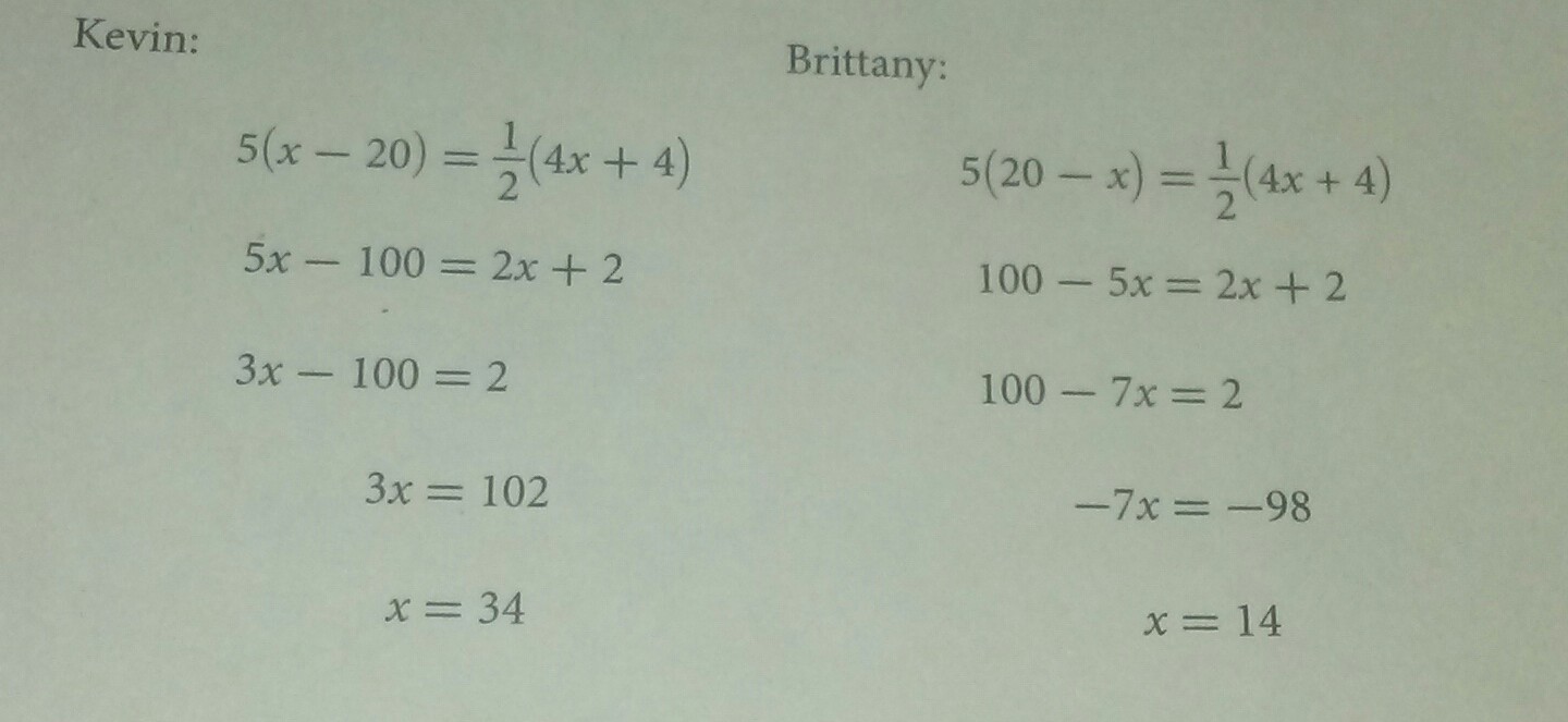 Kevin and Brittany write an equation to represent the following relationship, and both students solve their equation. Who found