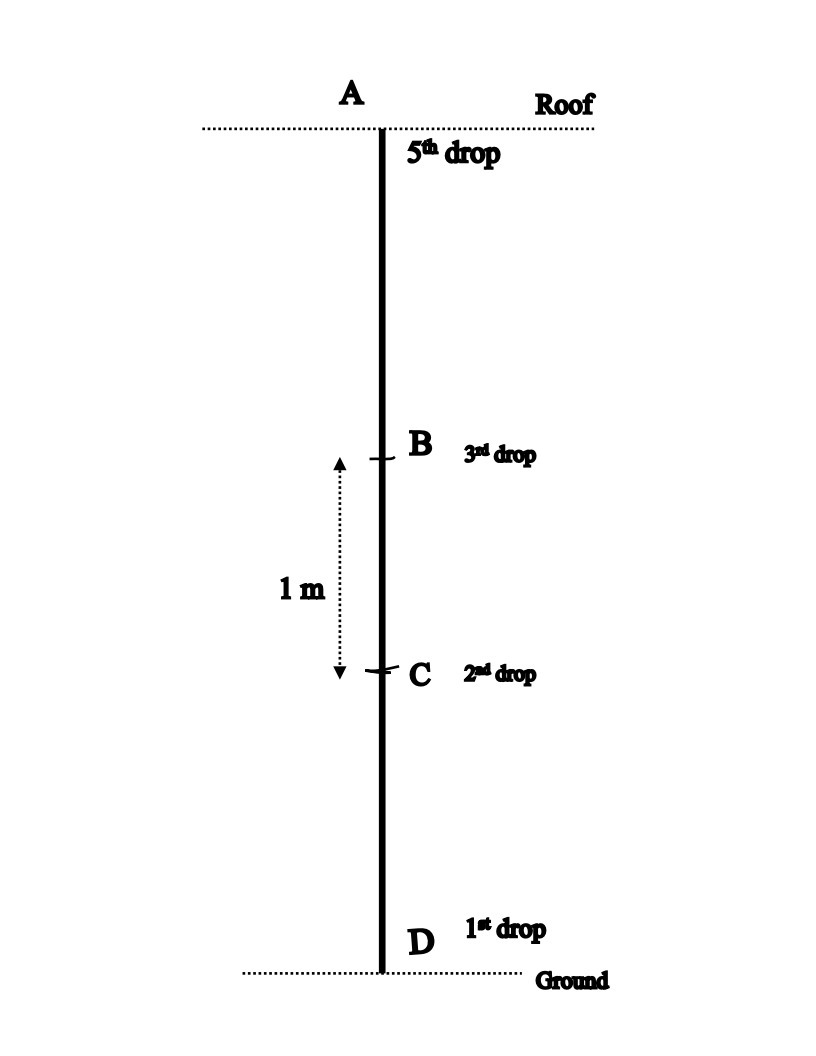 Water drops fall from the edge of a roof at a steady rate. a fifth drop starts to fall just as the first drop hits the ground. a