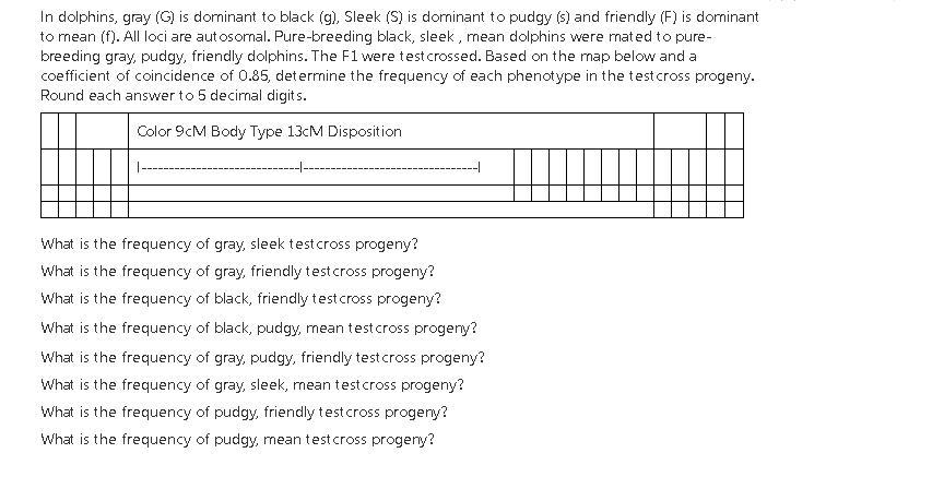 loci are autosomal. Pure-breeding black, sleek , mean dolphins were mated to pure-breeding gray, pudgy, friendly dolphins. The F1 were testcrossed. Based on the map below and a coefficient of coincidence of 0.76, determine the frequency of each phenotype in the testcross progeny. Round each answer to 5 decimal digits.