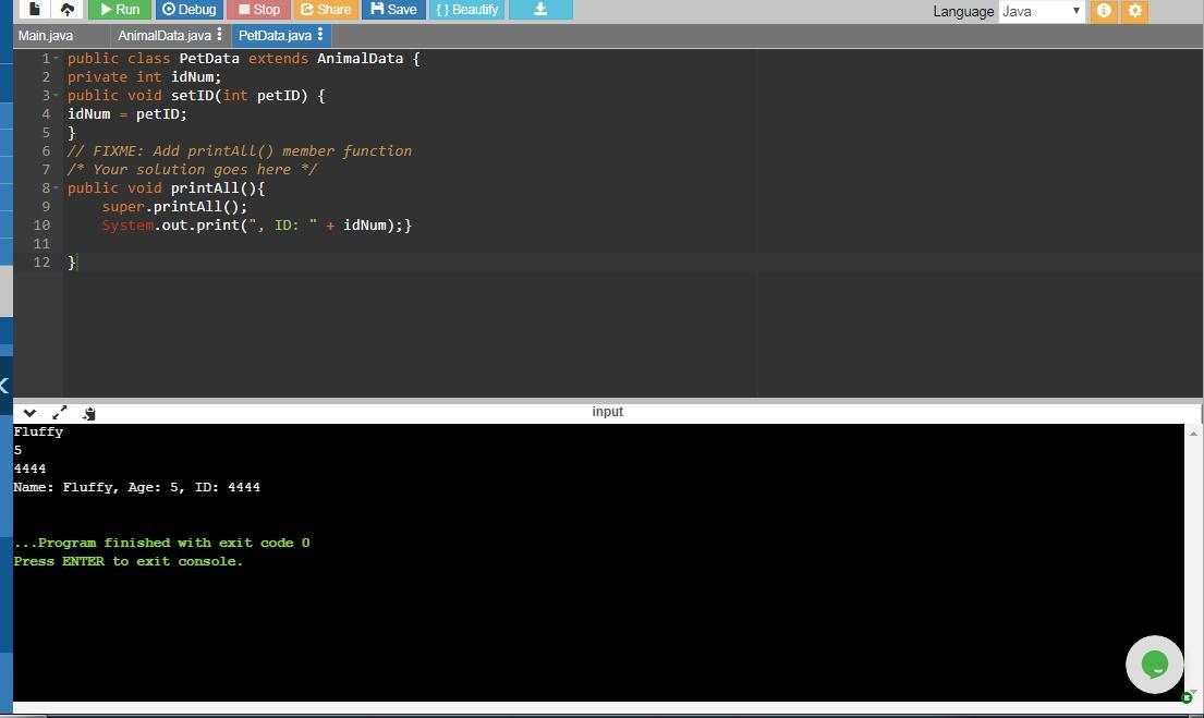 Define a method printAll() for class PetData that prints output as follows with inputs "Fluffy", 5, and 4444. Hint: Make use of