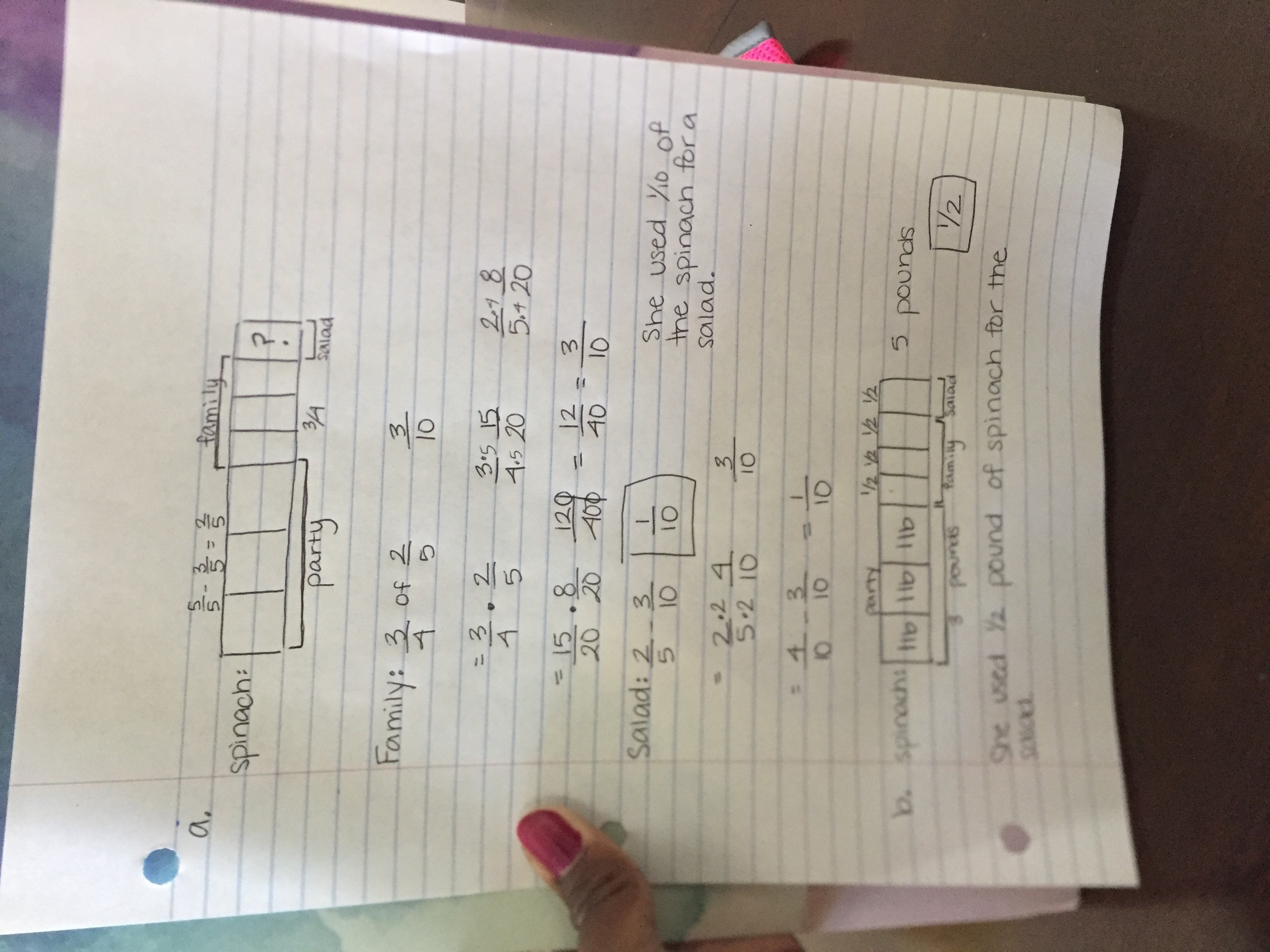 We can tackle each segment of this issue with a "fraction strip," which visually represents the distribution of spinach used for the party, family, and salad. Refer to the attached image for a comprehensive step-by-step breakdown on how to multiply the fractions to uncover the accurate portions.