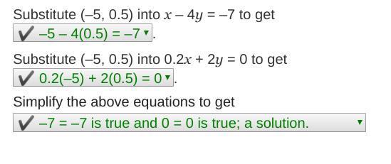(-5, 0.5) serves as a solution for the equations x – 4y = –7, 0.2x + 2y = 0.