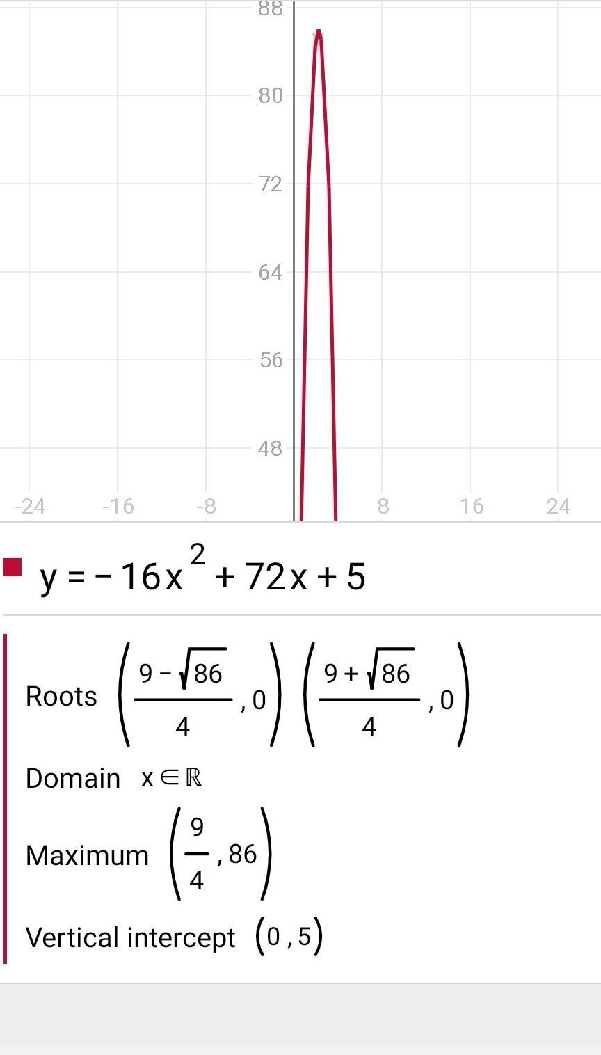 An object is launched into the air. The projectile motion of the object can be modeled using the function h(t) = –16t2 + 72t + 5