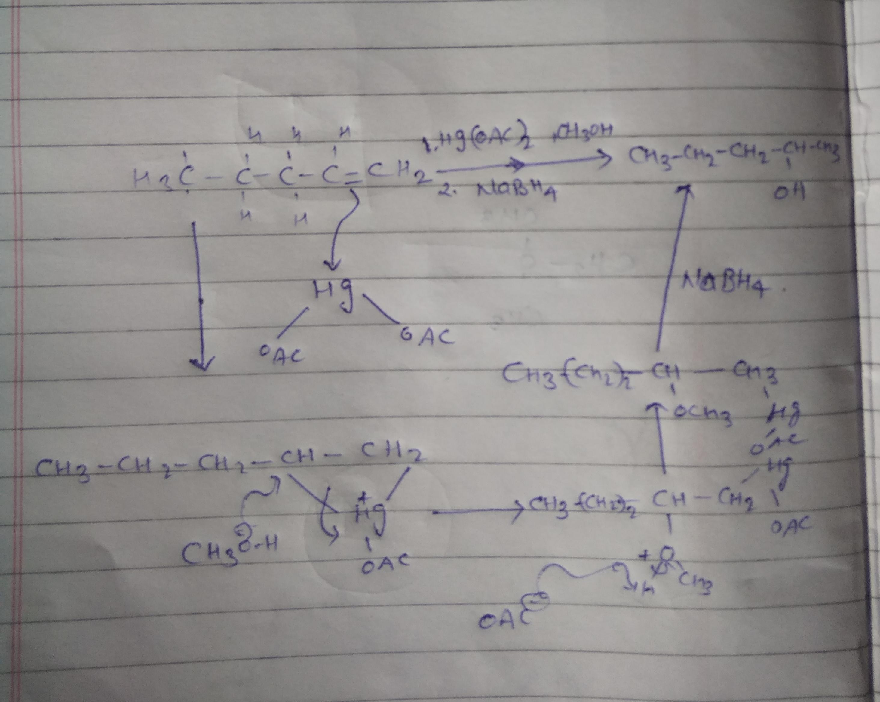 When pent-1-ene is treated with mercury(II) acetate in methanol and the resulting product is reacted with NaBH4, what is the pri
