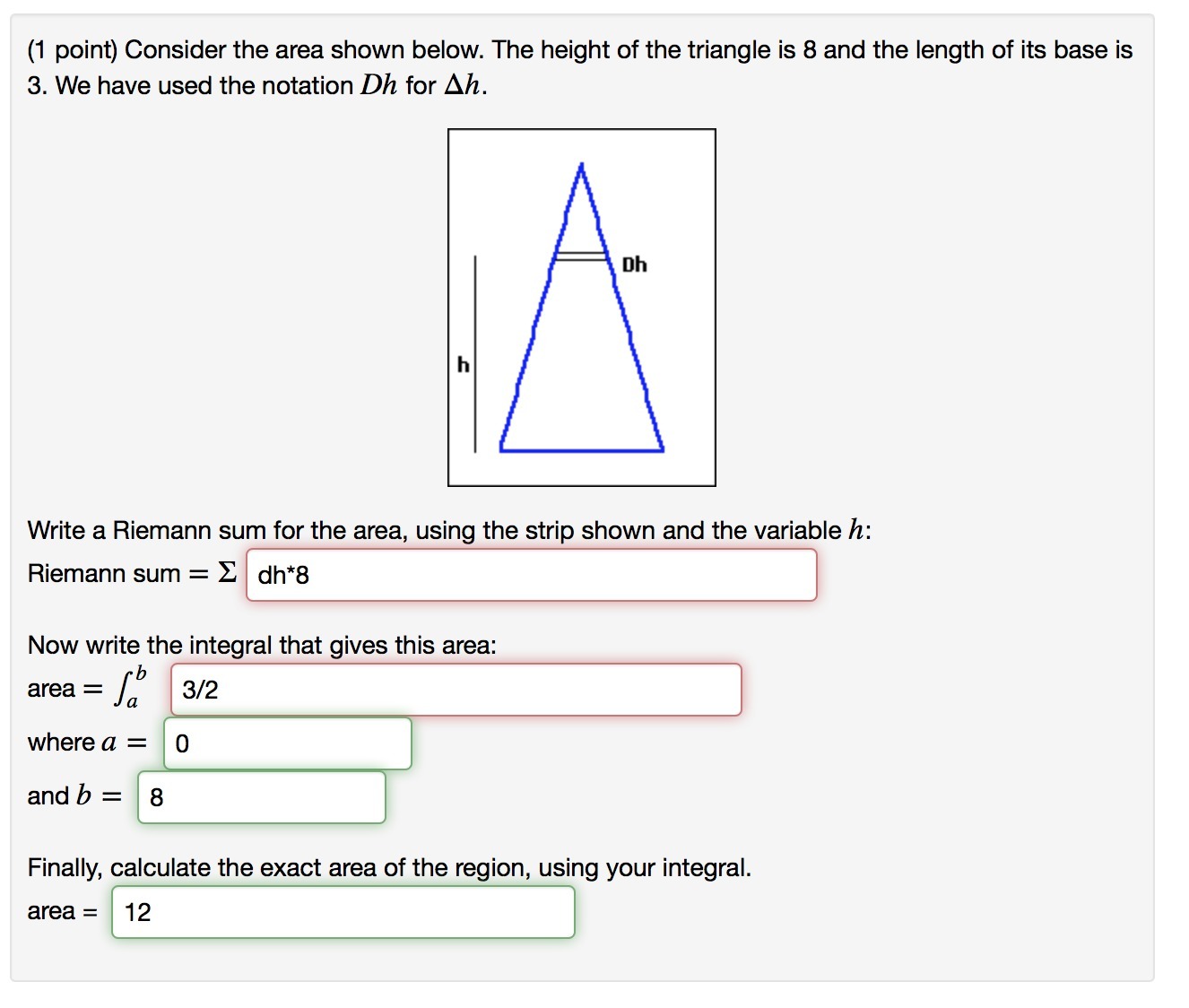 Consider the area shown below. The height of the triangle is 8 and the length of its base is 3. We have used the notation Dh for