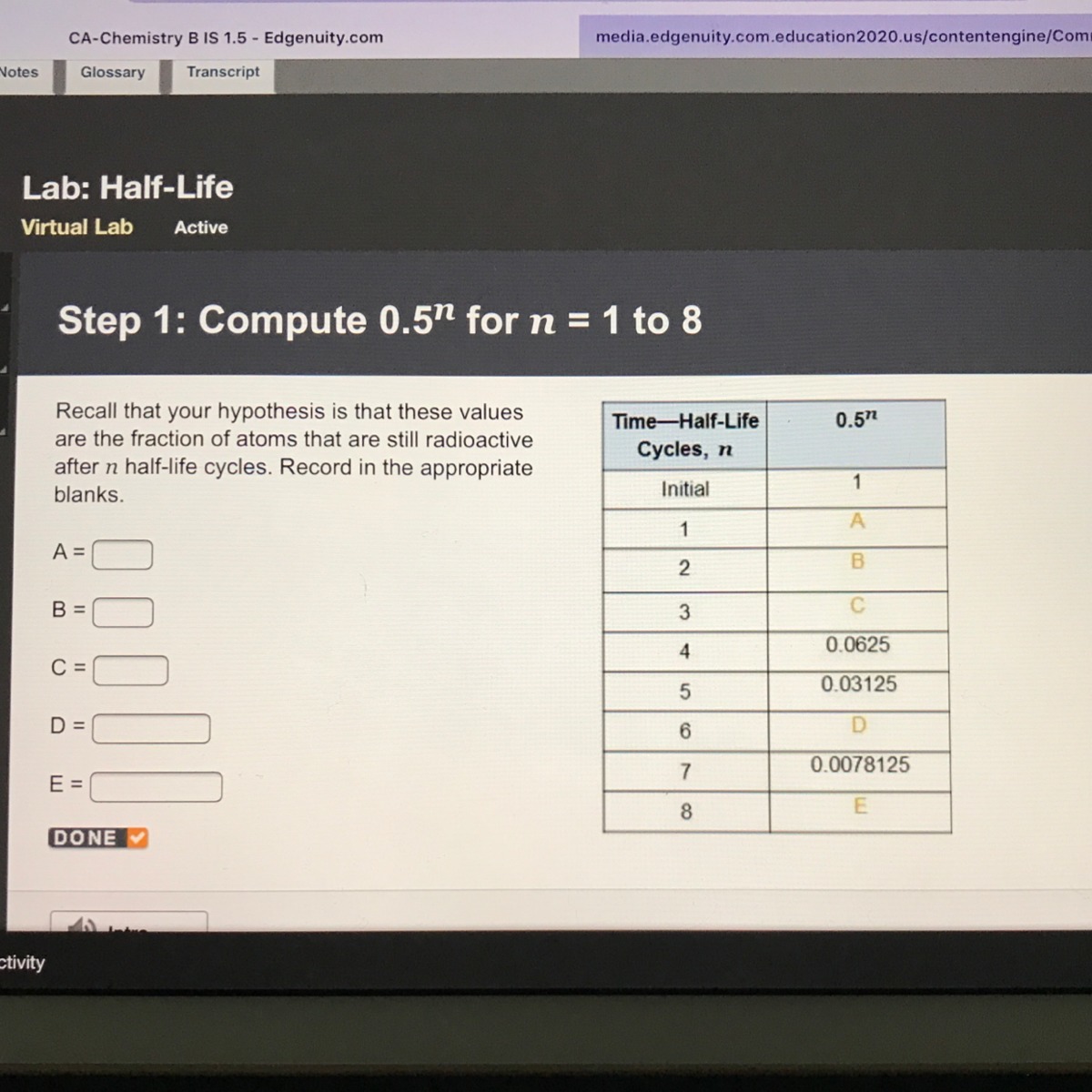 Answer: A= 0.5, B = 0.25, C = 0.125, D = 0.015625 and E = 0.00390625