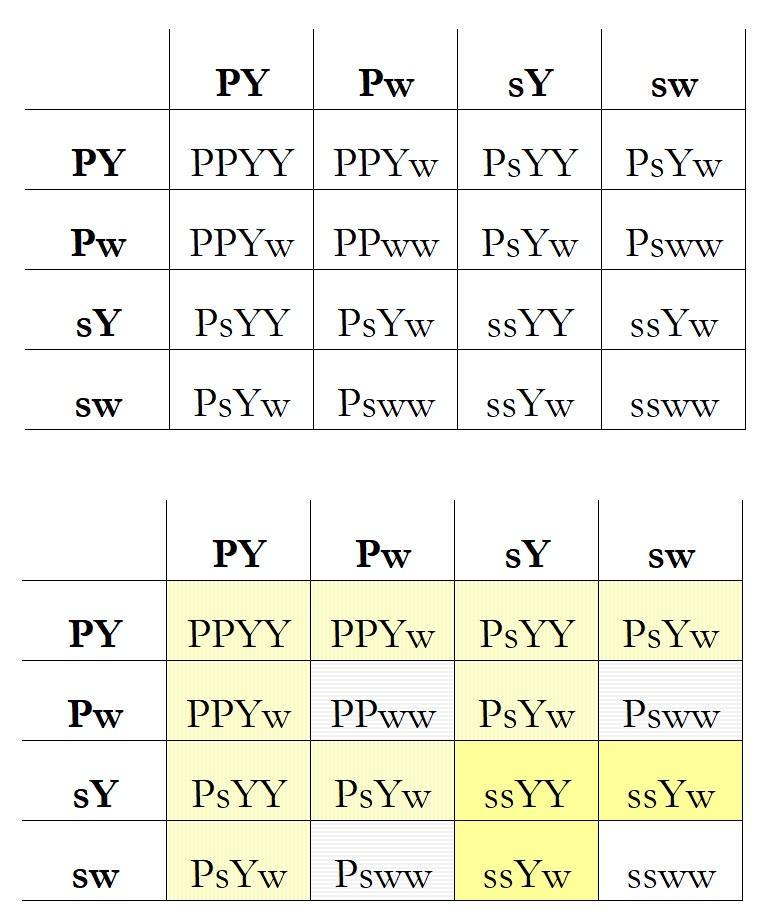We will denote dominant yellow with Y, recessive white with w, dominant pattern with P, and recessive solid with s. It is common for dominant and recessive traits to use the same letter, but using distinct letters here simplifies identifying the phenotypes.