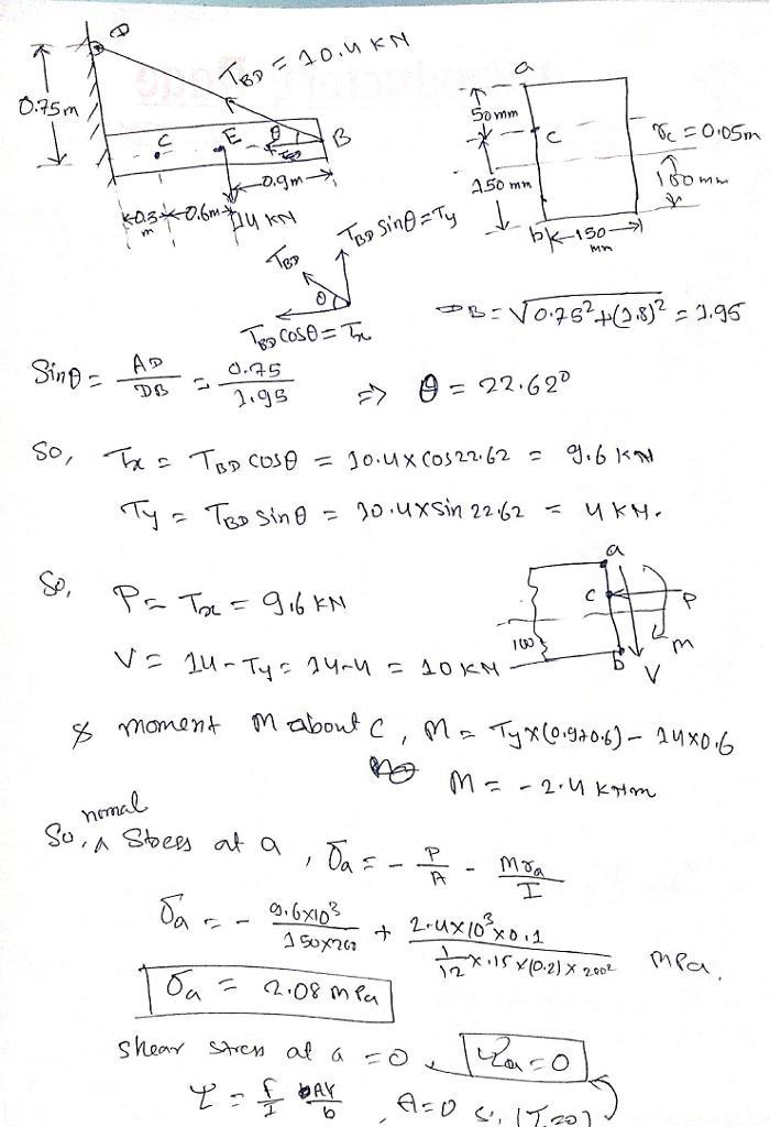 The cantilever beam AB has a rectangular cross section of 150 × 200 mm. Knowing that the tension in the cable BD is 10.8 kN and
