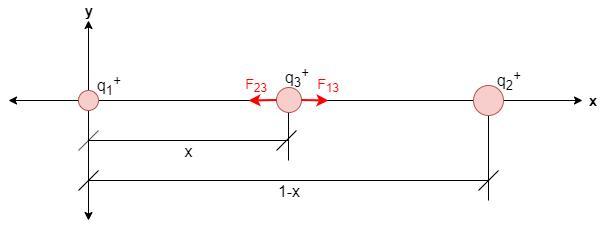 We assume a positive charge q₃, thus F₁₃ and F₂₃ exhibit repulsive forces that need to be equivalent so the resultant force is zero: