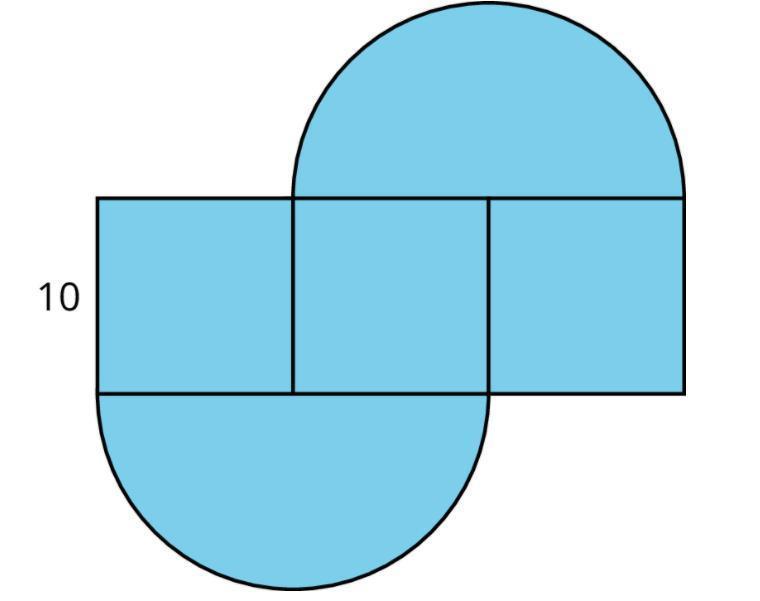 The complete perimeter of the shape is therefore the perimeter from the two semicircles combined with that of the four squares = 100+20π