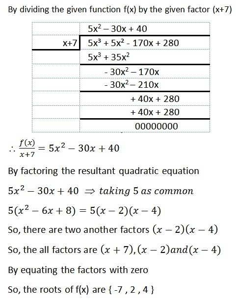 One factor of f(x) = 5x³ + 5x² - 170x + 280 is (x + 7). What are the roots of this function? Utilizing The Remainder <span>Theorem