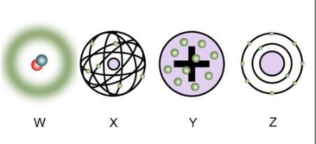 W corresponds to the current widely accepted atomic model: a nucleus surrounded by an electron cloud, where the positions and orbits of electrons around the nucleus are defined by regions (linked to specific energy levels) where the probability of finding an electron is highest. It's key to note that this model was refined through the contributions of quantum physics by Louis de Broglie and Erwin Schrodinger.