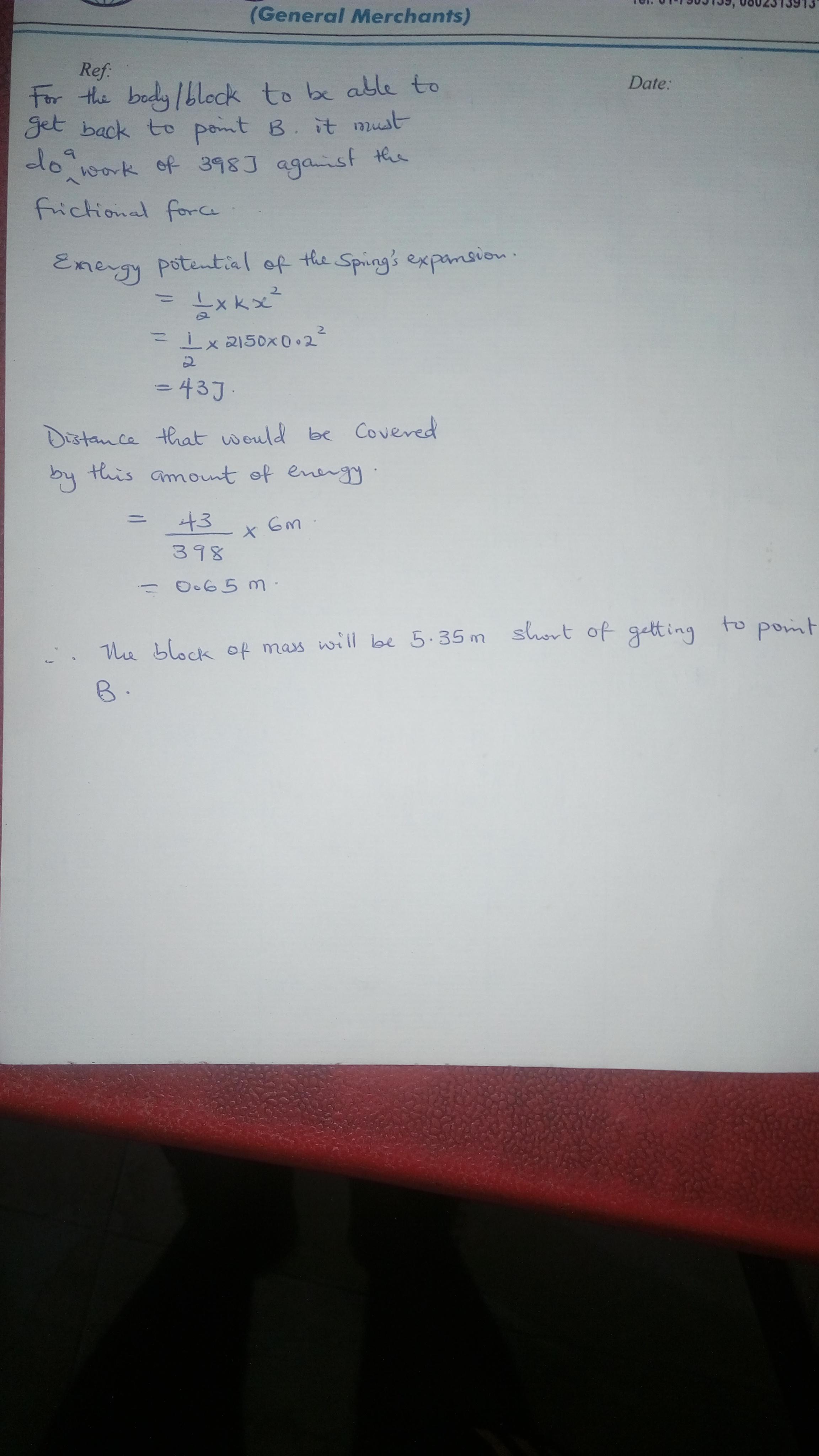 For more details on how this issue was resolved, refer to the attached material. The solution for part (a) separates the body’s movement into two segments: from point A to B, and from B to C. The total system energy originates from the initial gravitational potential energy, which transforms into work against friction and into work compressing the spring. A work of 398 J is needed to counteract friction over the distance of 6.00 m. The energy used for this is lost since friction is not a conservative force, leaving only 43 J for spring compression. When the spring expands, it exerts a work of 43 J back on the block, which is only sufficient to move it through a distance of 0.65 m, stopping 5.35 m short of point B.