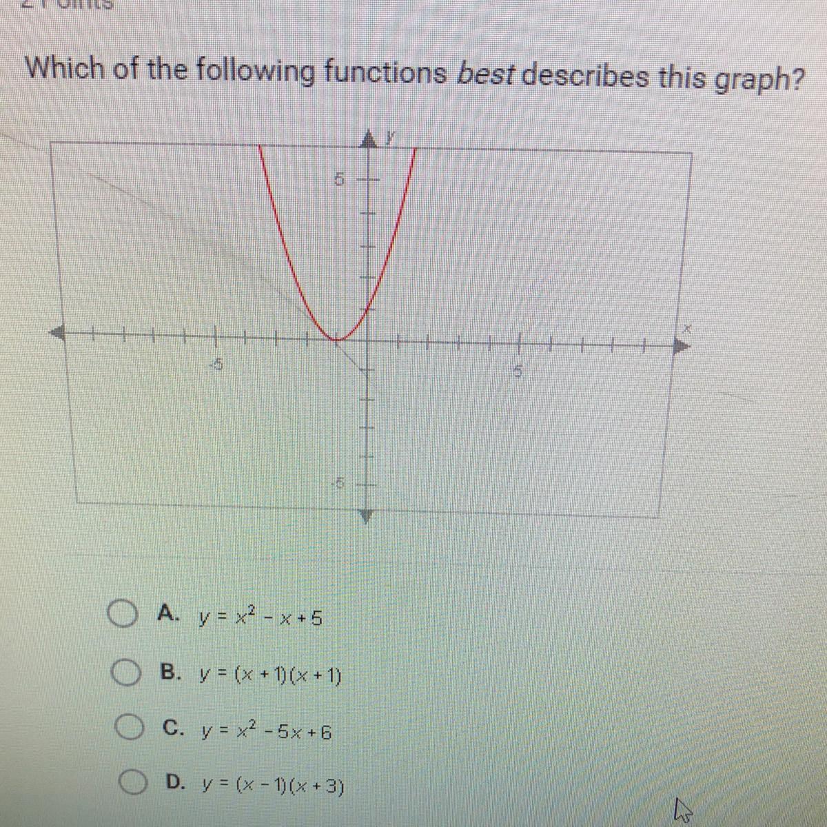 Detailed explanation: This represents a quadratic function due to its parabolic shape, and it intersects the y-axis at 1.