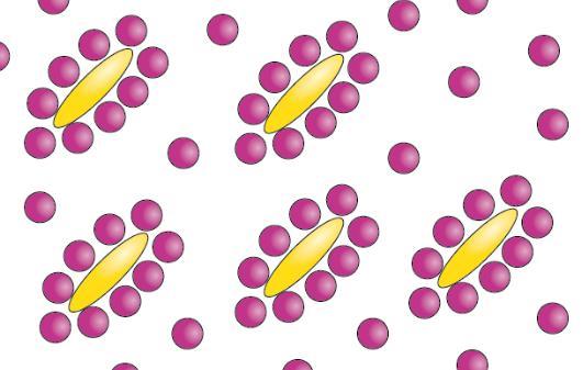 Behold a mixture of oily/hydrophobic (yellow) and water (purplish) molecules. recall that hydrophobic regions are ones with few