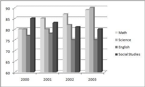 The social studies bar starts just under 85 in 2000 and drops to just below 80 by 2003, showing a decline of approximately 5 points.