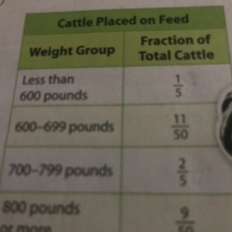 The fraction representing the total cattle weighing 700 - 799 pounds is 2/5