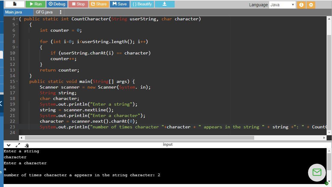 System.out.println("number of times character "+character + " appears in the string " + string +": " + CountCharacter(string, character));  }  }