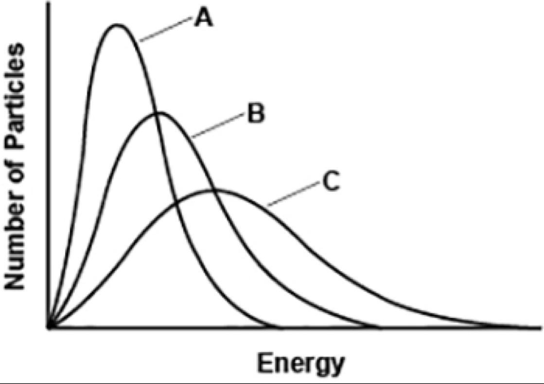 • The graph shows the distribution of energy in the particles of two gas samples at different temperatures, T1 and T2. A, B, and C