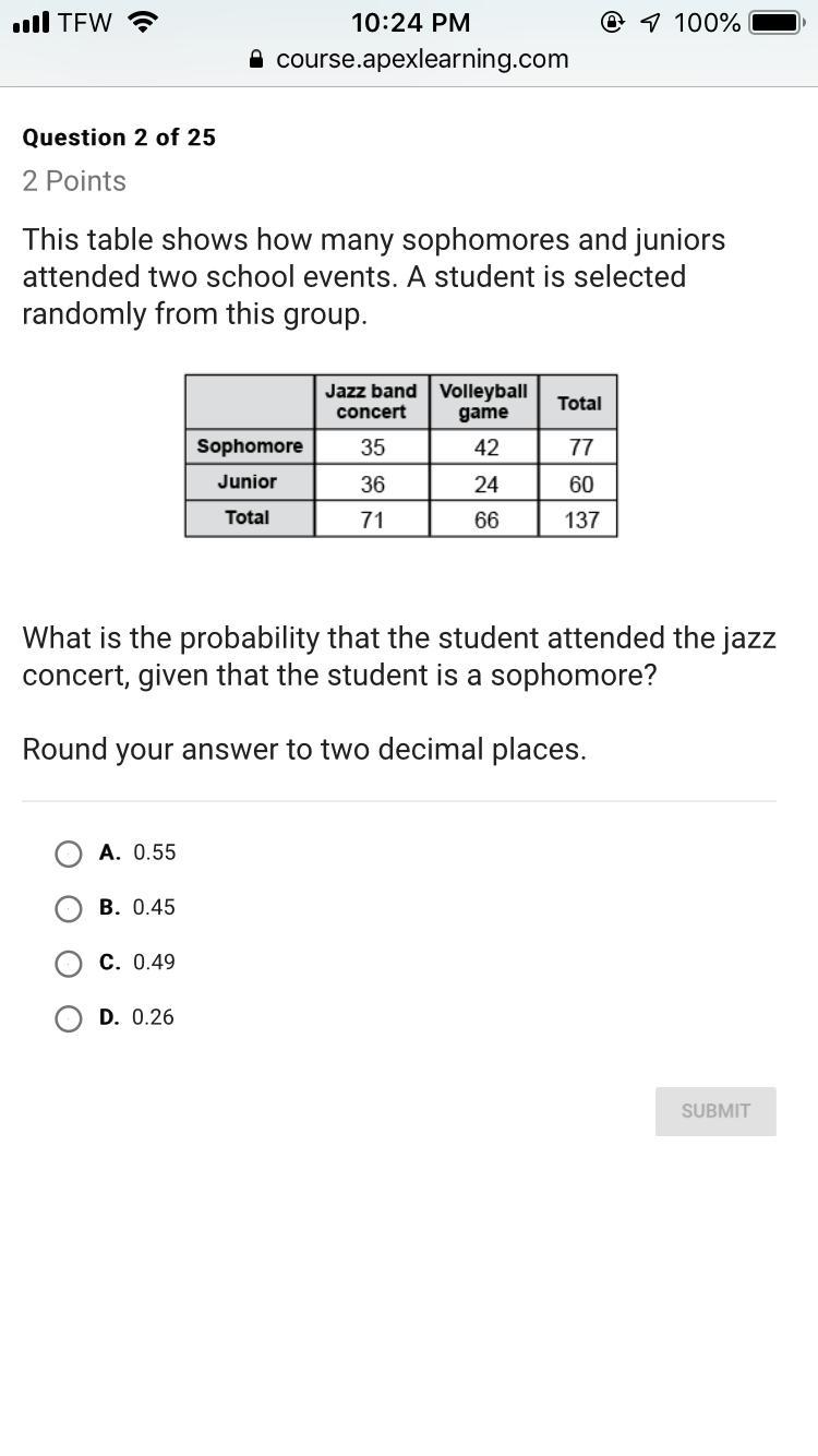 P(B|A)=\dfrac{\text{P(A and B)}}{\text{P(A)}}\\\\=\dfrac{\dfrac{35}{137}}{\dfrac{77}{137}}\\\\\\=\dfrac{35}{77}=0.454545454545\approx0.45