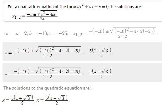 Using the quadratic formula leads us to solve for the speeds after the explosion, specifically where a=2, b=-10, and c=-25.