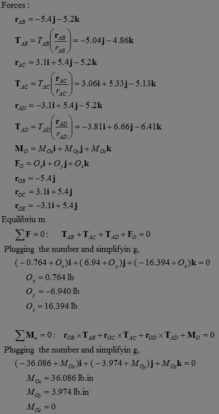 The initially bent young tree has been straightened by adjusting the tensions of the three guy wires to AB = 7 lb, AC = 8 lb, and AD = 10 lb. Please calculate the force and moment reactions at the trunk's base point O, disregarding the weight of the tree.
