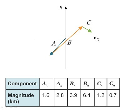 The image shows the displacement of a motorboat. The data table shows the magnitudes of the components of each displacement vect