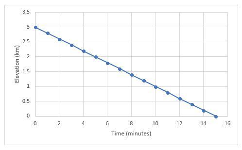 If the plane descends at a speed of 0.2 kilometers each minute and lands after 15 minutes, that suggests the plane initially began its descent at an elevation of 3 kilometers (at time t=0). Following this, a table is created based on this initial information.