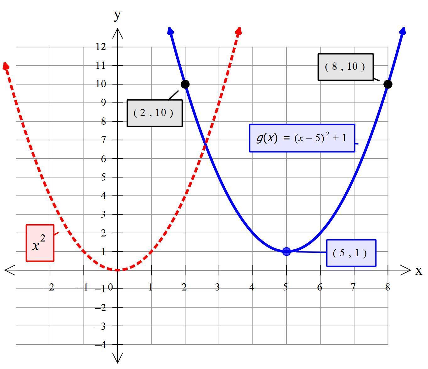 As depicted, g(x) intersects (2, 10), has a vertex at (5, 1), and crosses through (8, 10)