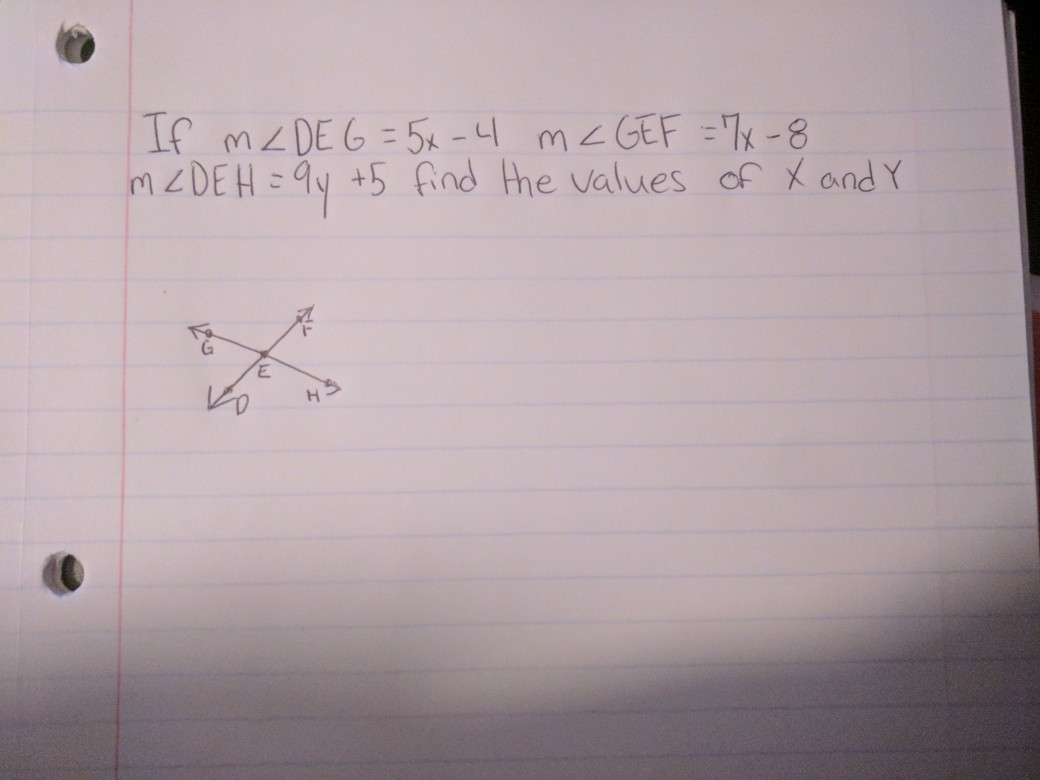 [GEOMETRY] If m∠DEG= 5x - 4 m∠GEF=7x - 8 m∠DEH= 9y + 5 find the values of x and y