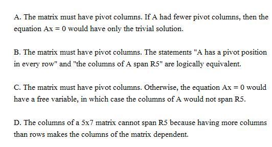 The correct answer is "Option B." There seems to be an error with the options provided; however, the appropriate choice is detailed in the attached file. If the column of the matrix and the span of A are both equal to R^5, then A must have a pivot in each row, hence resulting in five pivot columns that confirm choice B as accurate.