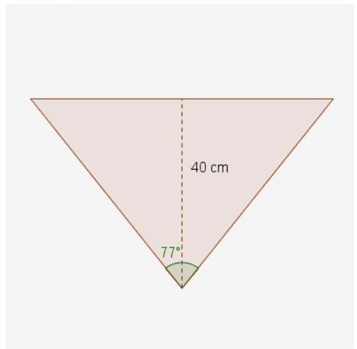 and the angle between the sloping sides is 77°. What is the shortest distance between the tip of the cone and its rim?
