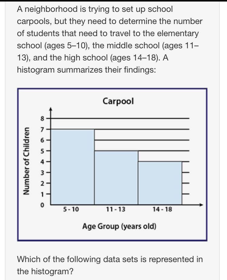 Histogram titled Carpool, with Number of Children on the y axis and Age Groups on the x axis. Bar 1 is 5 to 10 years old and has a value of 7. Bar 2 is 11 to 13 years old and has a value of 5. Bar 3 is 14 to 18 years old and has a value of 4.
