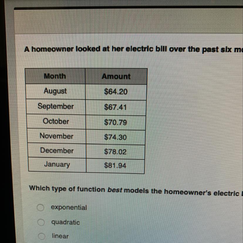 Which type of function best models the homeowner’s electric bill over the past six months?