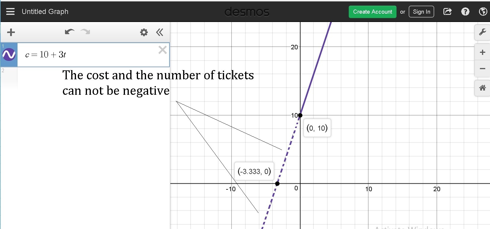 Which graph shows the equation c = 10+ 3t, where c is the total cost of going to the carnival and t is the number of $3 tickets