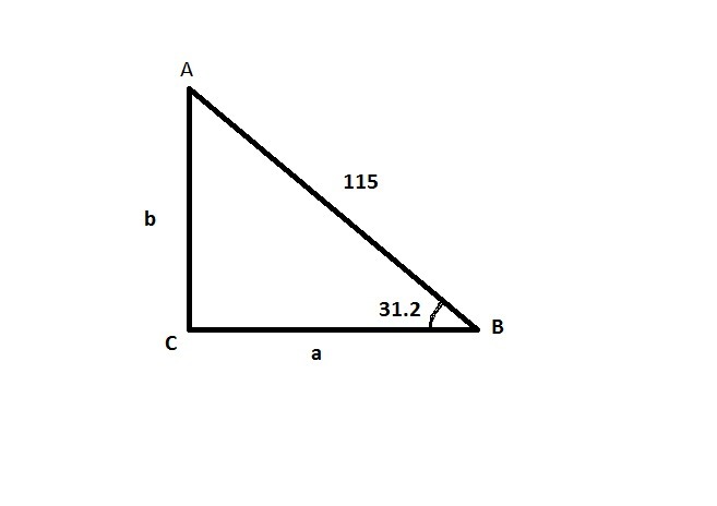 A right triangle (Triangle 1) has a hypotenuse measuring 115 mm, and angle α = 31.2°. What are the dimensions for a, b, and angle β?