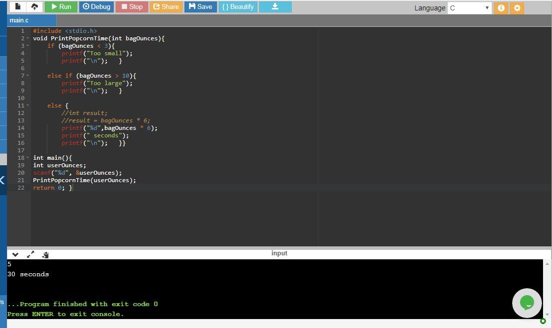 // this begins the function PrintPopcornTime body, accepting an integer variable //bagOunces as a parameter